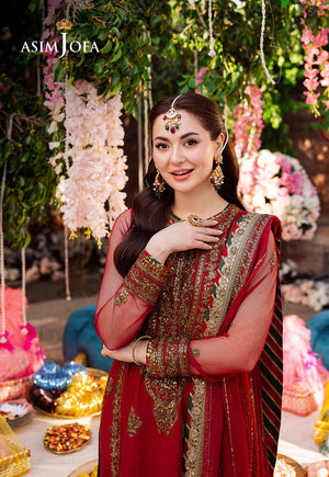 Embrace the vibrant hues with this ruby number from the sparkling Jag Mag Collection. Cloaked in a rich red hue, this ensemble is intricately bedecked with antique gold zari and green threadwork reflecting the festive spirit of celebration. The 3mm sequins twinkle with an ethereal glow illuminating the grandeur of the gorgeous neckline and the all-over shirt embroidery. The embroidered dupatta completes an outfit that’s designed to make you look ravishing.