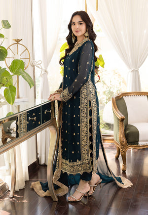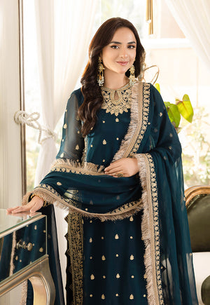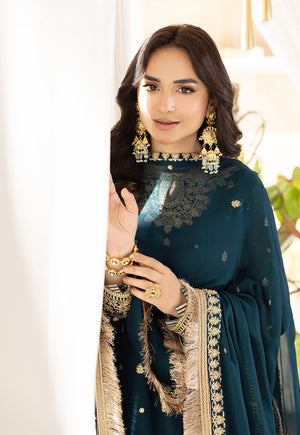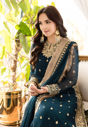Give yourself a minimalist yet impactful aesthetic with this Essex Green number from ‘The Meerub’ by Asim Jofa. The juxtaposition of chiffon and poly cotton in this ensemble creates a balance of lightness and buoyancy feel. The chiffon dupatta with side borders is the flawless finishing touch. Yumna Zaidi radiates an ethereal aura in this ensemble that is nothing short of a poetic masterpiece in motion.