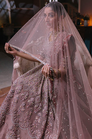A magical ethereal pink 'Aysel' is delicately embellished with a mélange of shimmering silver and gold sequin, pearls and sparkling stones. 12 exquisitely embroidered panels come together to create a spectacular heritage peshwas, with a fully composed bodice, bustier and bejewelled belt. The dupatta with amplified silk and tinsel blooms embroidered all along its borders completes the stunning look inspired by eastern royal regalia. This couture like ensemble is a collectors dream, classic, elegant and timeless.
