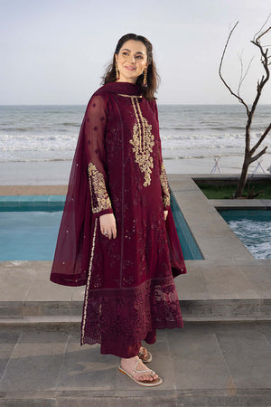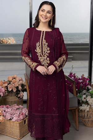 'Carnelian' is created on a burgundy chiffon fabric with sequin embellishments and exquisite artistry done on the neckline and sleeves with delicate embellishments of Kora, dabka, and Pearls to make this attire more pleasing. Paired with an enigmatic embroidered chiffon dupatta with apart of sequins all over it and raw silk trousers. To lighten up the outfit even more, pair this beautiful festive attire with trendy jewelry pieces.