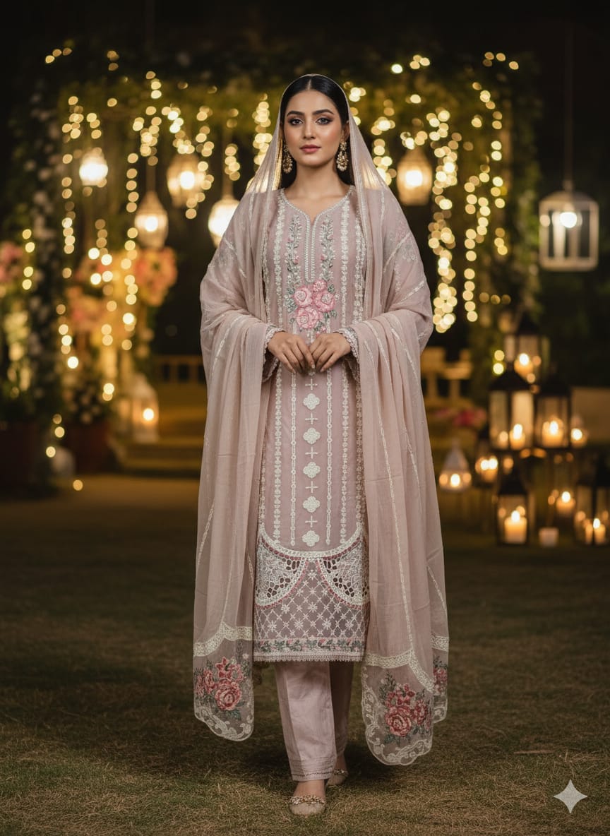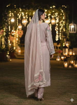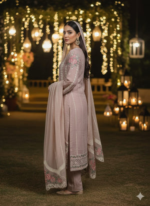 It's time to take your fashion game farthest with a 3-piece beige chiffon ensemble. The gilded embroidery elaborates the artistic detailing over the shirt. The striking touch of red and maroon intimately complements the outfit's colour. The dupatta accentuates proficiently crafted embroidery. It comes with the silk dyed trouser, draped in elegance.