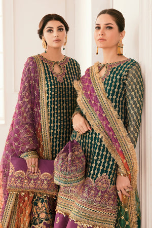 Experience sheer luxury with our exquisite 3-piece chiffon ensemble, where the shirt boasts a captivating combination of gleaming green and magenta purple. Opulence is defined by intricate embroidery adorning the front, back, and sleeves. The chiffon dupatta is a masterpiece of appealing hues and expertly crafted embroidery, complemented by a threaded border. Accompanied by a silk trouser, you have the choice to curate your own style statement, opt for the unstitched option for a personal touch or let us stitch the perfect dress for you. Choose between a short shirt with shararah or a long shirt with churi-dar pajama to suit your individual style.