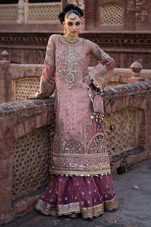 PRODUCT DETAILS: Introducing the exquisite 'Arezoo' ensemble in the enchanting shade of Rose Milk Pink. This ethereal creation features an organza embroidered-embellished shirt with a dark pink hem patch, accentuated by an embroidered-embellished satin silk hem border adorned with twin sequins. The sleeves are a work of art in themselves, showcasing two different organza patches and satin silk border, beautifully embroidered and embellished.The ensemble is elegantly completed with an organza dupatta, featuring two distinct pallus – one in darker pink organza and the other adorned with intricate embroidery on satin silk, along with an alluring four-sided border. The matching gharara, designed in organza with a satin silk finishing border, adds a touch of sophistication and grace to this breathtaking 'Arezoo' ensemble. A perfect choice for brides seeking timeless beauty and sheer elegance.