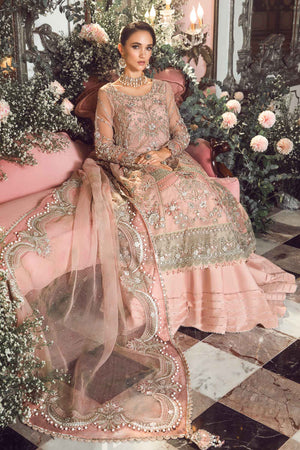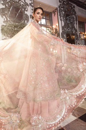 Celebrate opulence with our pastel pink organza silk three-piece embroidered hand-embellished ensemble with applique work paired with digitally printed organza dupatta.